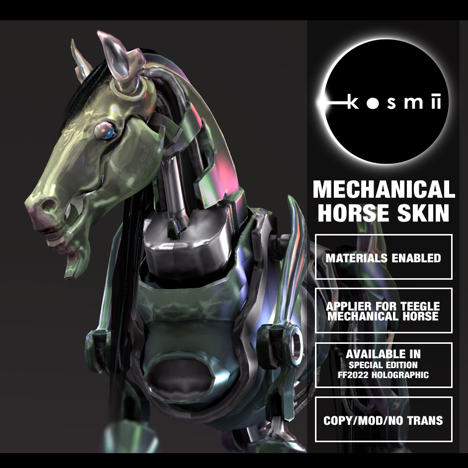 Kosmii - Mech Horse SkinsShynne NirvanaApr 21, 20221 min readUpdated: Nov 16, 2022Available on marketplace. Also available inworld.