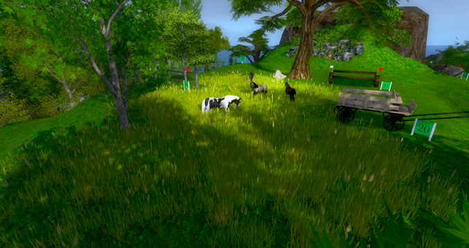 The landing zone and entrance area is where you'll first arrive, and the balloon ride can be found not far off. The start of the Cross Country course is also nearby, with a horse rezzer for your convenience, and a HUD you can wear to time yourself on the jumps. A teleport board is here, and in many other spots, and you can get a TP HUD as well. There are two sims of riding trails, plus another whole forest sim in the sky. And for dressage riders, Western riders and jumpers, we also have an equestrian platform with everything you need, including horses to rez, or ride your own.